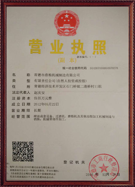 企業(yè)堅(jiān)持“質(zhì)量、口碑就是我們的生命”的原則,嚴(yán)格執(zhí)行質(zhì)量標(biāo)準(zhǔn)檢驗(yàn)體系。生產(chǎn)的"鼎糧"牌系列產(chǎn)品,產(chǎn)品質(zhì)量優(yōu),性價(jià)比高,深受廣大新老客戶的青睞,通過了各級(jí)部門的鑒定認(rèn)可,立式、臥式液壓榨油機(jī)均榮獲農(nóng)機(jī)推廣證。