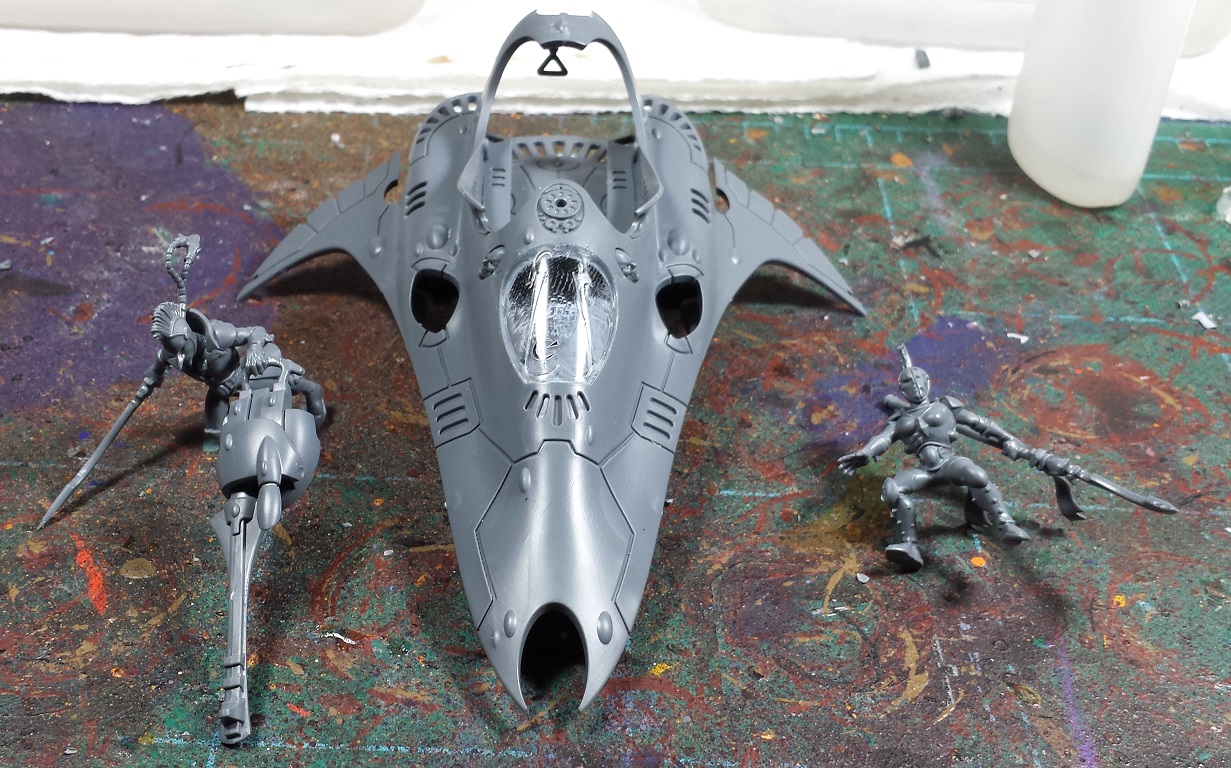 Got some decent hobby time in last night after it had cooled off a bit and started off by putting together the Starweaver transport for the troupe - First time assembling this kit and it was a bit of a fraught affair! I think I got the measure of it though, so the upcoming Voidweaver should go together a bit easier. Hoping to keep the painting simple I left the two passengers separate, but getting them posed properly was certainly a struggle!