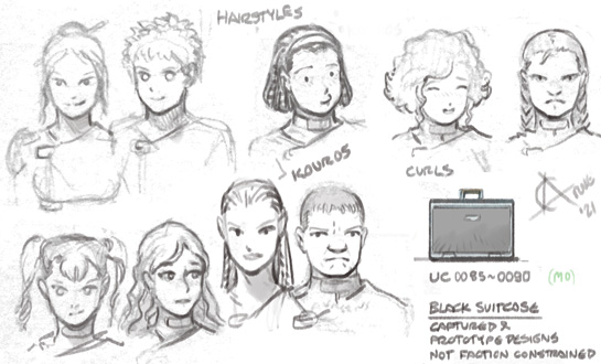 Hairstyle tests. Haven't sketched much on the characters yet.