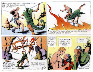 my previous Raymond essay, Dale Arden's role in the series is one of the strongest deviations from the strip's putative inspiration, Edgar Rice Burroughs' JOHN CARTER series. It may be that Raymond chose to give his hero a female "comrade-in-arms" in imitation of the science-fiction strip with which FLASH was competing, BUCK ROGERS. Dale Arden is, admittedly, not an experienced warrior-woman like BUCK's Wilma Deering. Yet Dale is much more gutsy than any of Burroughs' Martian princesses.