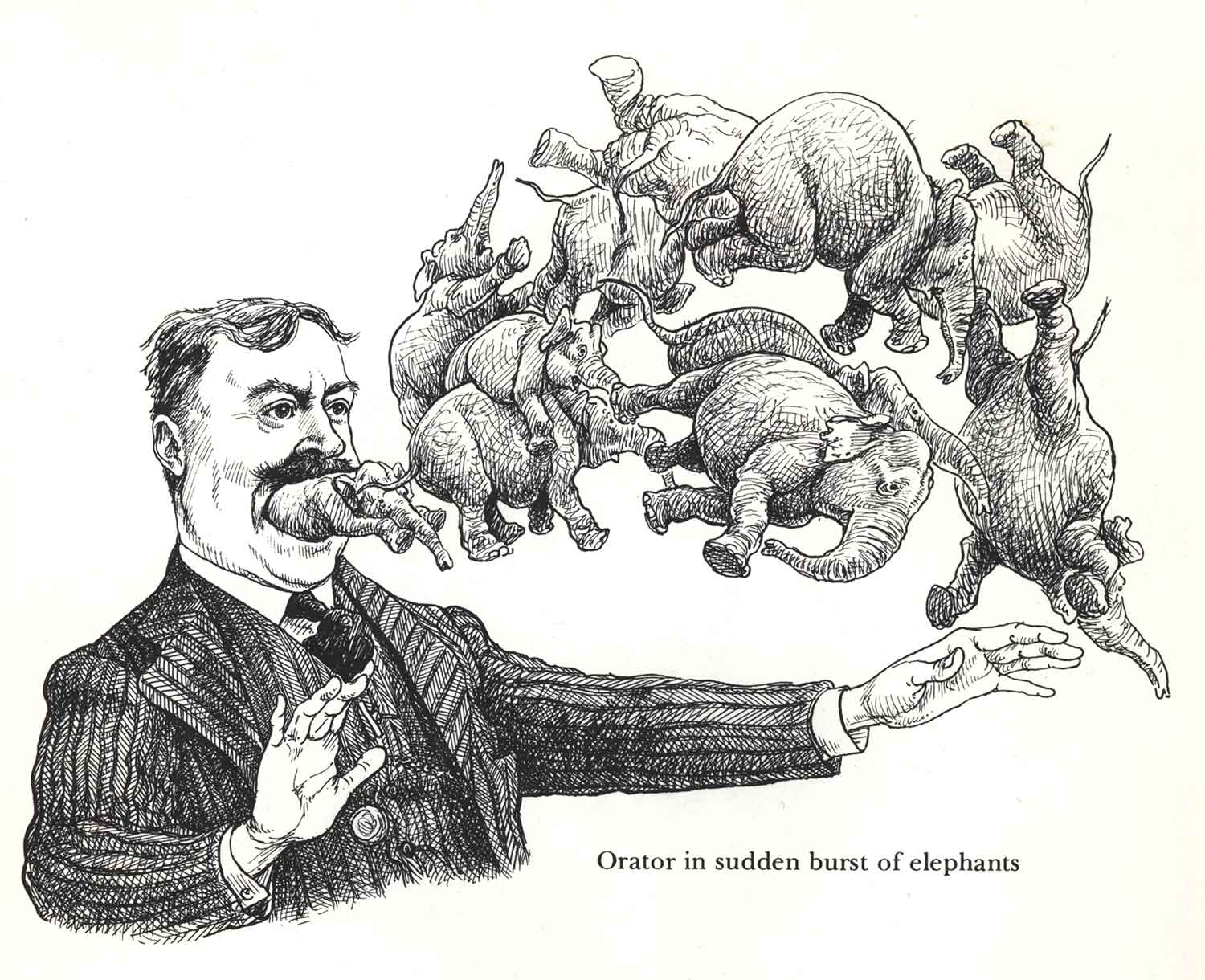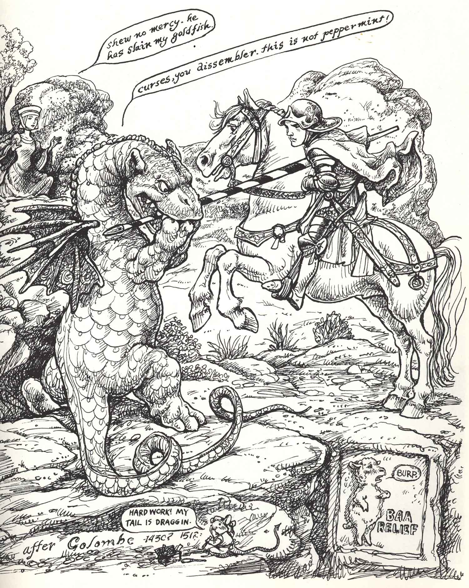 I believe it was largely Wallace Tripp who gave me the sense of what it was that a cartoonist did as opposed to an illustrator (along with Bill Peet, the subject of a future influences page): to capture the essence of the subject, be unabashed about exaggeration where it serves the purpose of the drawing, and to CREATE the character on the page, rather than merely depicting it.