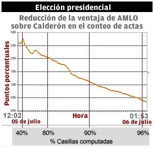 At 4:47 a.m. (Caracas time), with 97.6% of actas recorded, AMLO is ahead by 0.02%...but results are changing all the time and the latest results coming in are from the pro-Calderón north, so keep checking for updates...