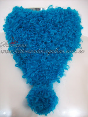 Foi feito com 98 pontos na agulha 6 de tricô trabalhando no ponto*2tr, 4m* por mais ou menos 20 cm. Passa uma tira com 200 correntes no meio e penduricos que quiser para dar seu toque pessoal. Usei um novelode Lã Seda da Círculo. Beijo!