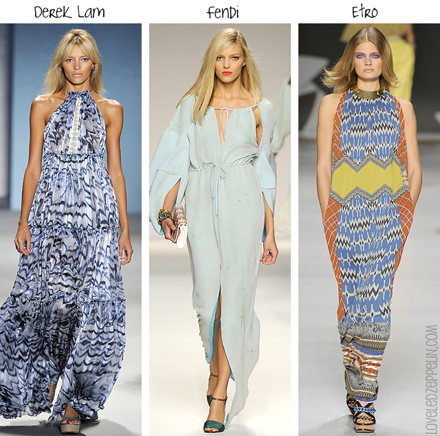 Favorito cada verano por ser tan cómodos y versátiles, los vestidos largos se convierten esta temporada en todo un must. En tejidos vaporosos, con diferentes estampados, informales o por el contrario extremadamente glamourosos, los maxi-vestidos estuvieron presentes en todos los desfiles de primavera-verano 2011. Desde la femenina versión estampada con vuelo y cuello halter de Derek Lam hasta la más elegante y chic de Fendi en un maravilloso tono agua, y la variante tribal más alegre de Etro, el maxi-vestido viene esta temporada en una amplia gama de estilo para elegir.