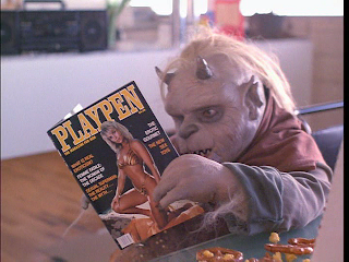 Anyway, the bounty huntress uses the jewel and a chalk pentagram to resurrect not only some guy in a cloak called Faust, but also our two Ghoulies. At least, I think they're Ghoulies (they sure don't look like whatever was on the box cover of Part 1). Whatever they're supposed to be, in reality they're little people running around in costumes and Halloween masks. And really, I'm not sure what I expected here...but I didn't expect that they'd talk. In slang-laden, pseudo-New York accents, no less. See…these Ghoulies aren't the bad guys; they're comic relief...merely included in the story to get into all kinds of slapstick trouble and utter lines like “Yo, man, I don’t think we’re in Oz anymore!” a la two mini-Danny DeVitos. In one scene, they end up rescuing a hooker who’s getting mugged at gunpoint. And then take her up on her offer of giving them a "treat."