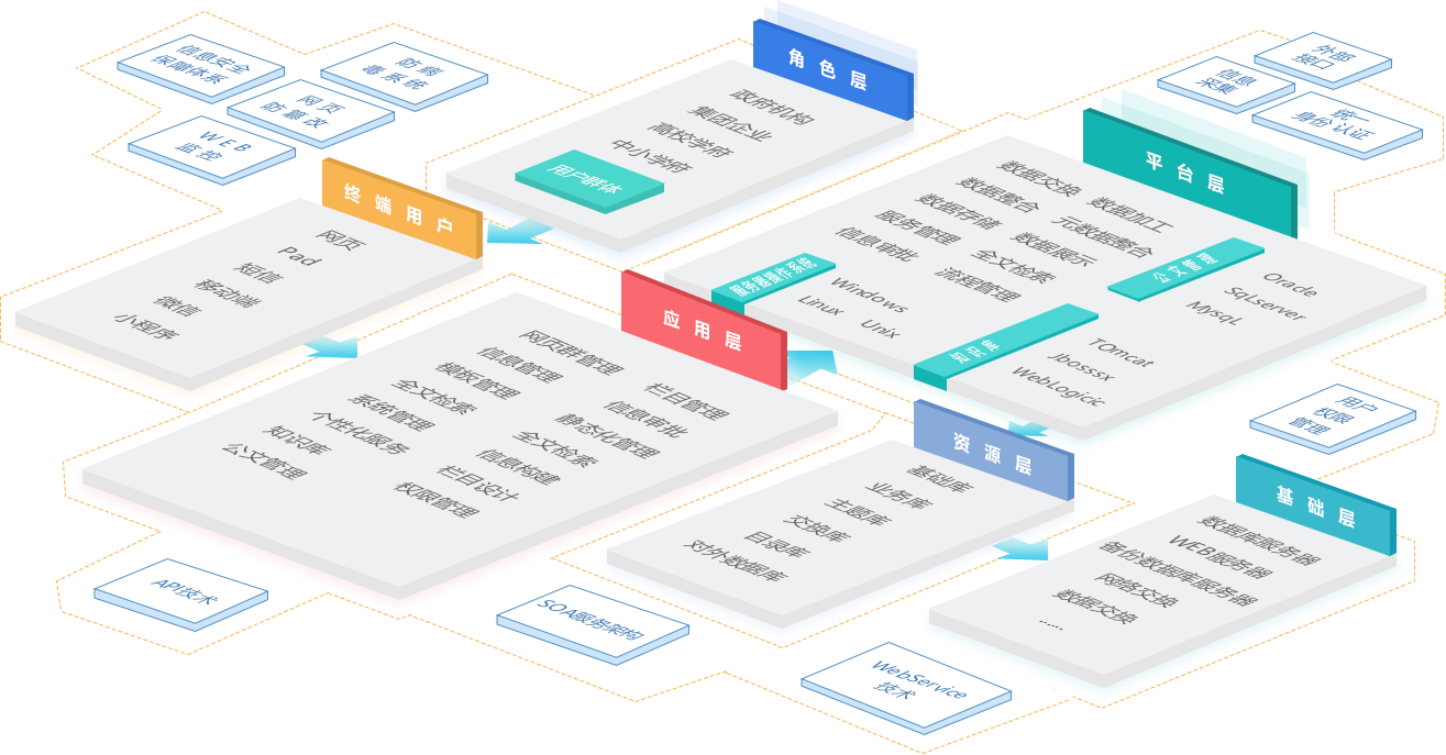 元數(shù)據(jù)管理、多維分類(lèi)管理、復(fù)雜流程審批、網(wǎng)上辦事、場(chǎng)景服務(wù)、資源目錄服務(wù)、網(wǎng)站SAAS服務(wù)