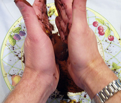 Once the ganache has cooled sufficiently, pipe or scoop into balls using a pastry bag or melon baller, depending on the method you choose. Set up workspace with a drop cloth and roll truffle centers using cocoa covered hands until round. Place in airtight container until ready to enrobe or consume.