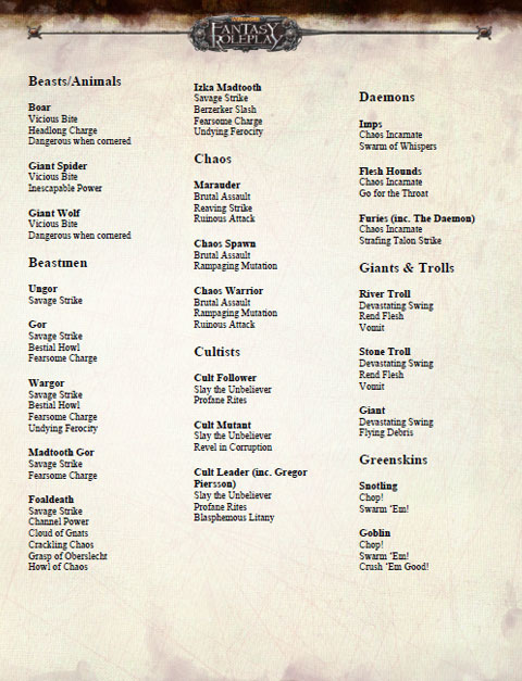 - Suggested action cards for all standard creatures in WFRP3 to date.