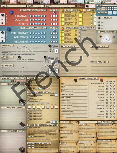 - French translated character sheet design for new and advanced players alike.