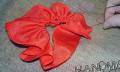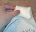 Шаг 15. Теперь делаем воротник. Отрезаем длинную полосу яркой ткани. Сшиваем ее по короткой части, чтобы получилось кольцо, а потом «сборим» (делается это просто: иголка идет в край ткани, как бы оборачиваясь вокруг нее и вновь втыкаясь в ткань см. фото). |