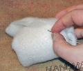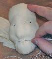 Шаг 6. Теперь нам надо наметить те места, где будут глаза и рот и слегка стянуть их нитками. Вставляем нитку сзади головы и вынимаем там где будет рот (то же самое для глаз), делаем несколько стежков, чтобы слегка затянуть углубления.