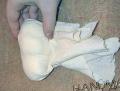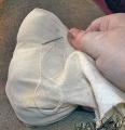 Шаг 16. Нам осталось сделать башмаки. Тут тоже есть несколько вариантов. Можно сшить нечто напоминающее колпаки, тогда туфли будут остроносые. Я сделала просто два мешочка, которые сшиваются по бокам, набиваются набивкой и потом пришиваются к ножке. |