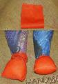 Шаг 13. Следующий этап. Мы берем две ткани разного цвета и вырезаем нечто похожее на детали, показанные на фото. Тут вы вольны делать, как хотите. Это будет тело клоунессы Клепы. Если вы хотите, можете сделать длинные толстые ноги, или длинные руки. Я резала вообще на глаз под размер головы. Все сшиваем, оставляя только дырочку в шее, чтобы вставить туда наш бюст с головой. |