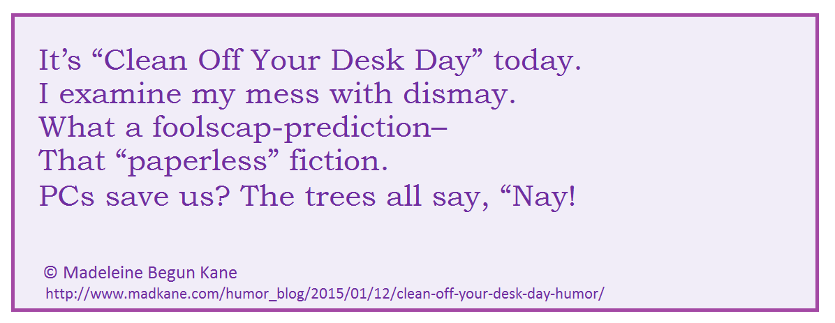 Tags: Chaos Humor, Clean Off Your Desk Day, Computer Verse, Desk Humor, January Holidays, Limerick Images, Messy Desks, Odd Holidays, Office Humor, Paper Humor, Paperless Office