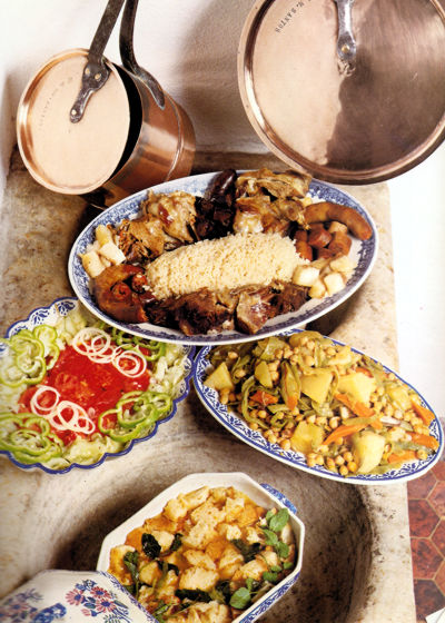 Dispõem-se no centro de uma travessa o grão, as vagens, as batatas e a abóbora. À volta colocam-se as carnes cortadas.