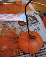 Iš fimo ar kito polimerinio molio suformuojame rutuliuką, jį pirštais suplojame šiek tiek, ir su dantų krapštuku įspaudžiame rieves. Iš vielos ruošiame kotelį- susukame ant pieštuko. Su vielutės galu įspaudžiame skylutę moliūgėlio viršuje. Kepame orkaitėje pagal instrukcijas tiksliai tiek kiek reikia, be vielos.Atvėsusius dažome akriliniais dažais, iklijuojame metalinį laikiklį. ir lakuojame.