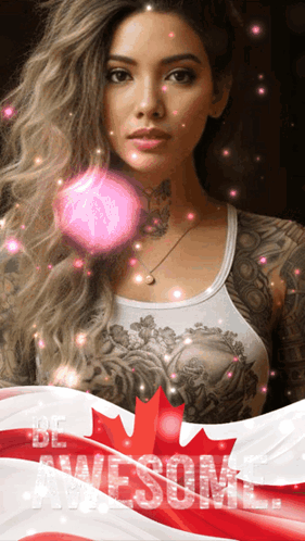 - Descripció del contingut: a woman with a tattoo on her chest stands in front of a canadian flag with the words be awesome written on it