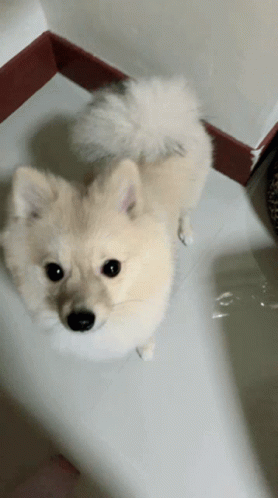Descripció del contingut: a small white dog is standing on a white tile floor