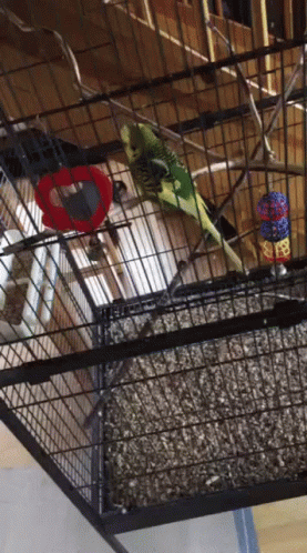 Descripció del contingut: two parakeets in a cage with a red ring on the top