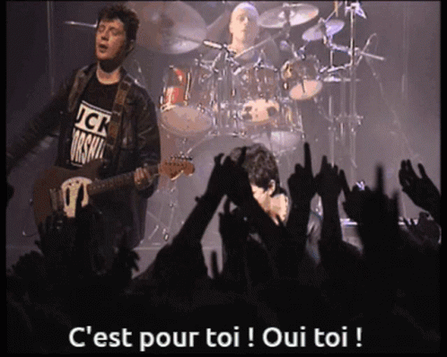 Descripció del contingut: a man playing a guitar in front of a crowd with the words c'est pour toi oui toi written below him