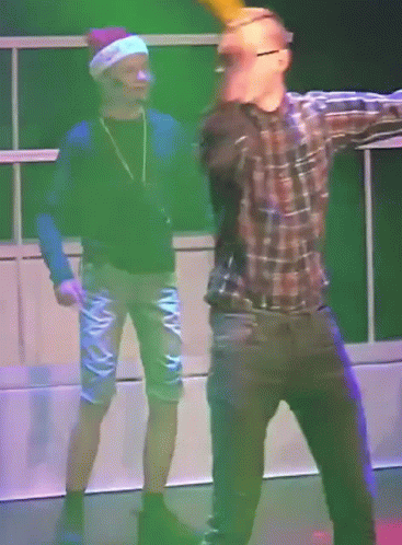 Descripció del contingut: a man wearing a santa hat is standing next to another man in a plaid shirt