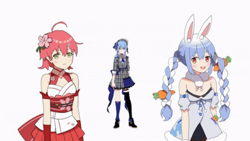Popis obsahu: three anime girls are standing next to each other and one has a flower on her head