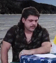 Popis obsahu: a man with a mullet and mustache is sitting at a table in front of a body of water .