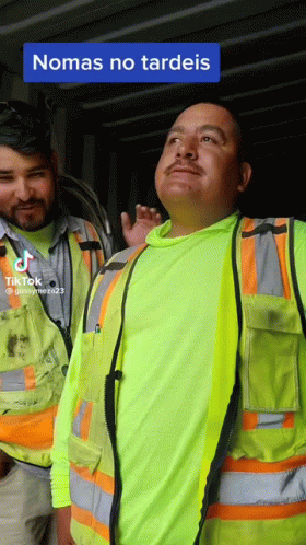 Popis obsahu: two men wearing safety vests are standing next to each other and one of them is looking up .