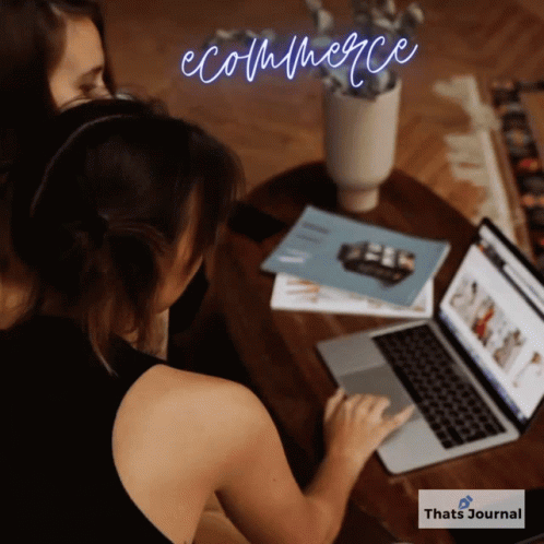 Popis obsahu: two women sitting at a table with a laptop and a sign that says ecommerce