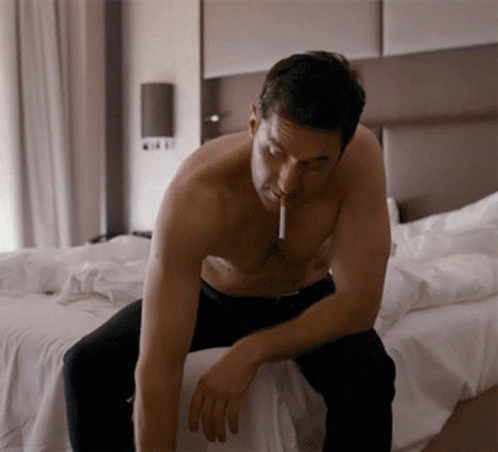 Popis obsahu: a shirtless man with a cigarette in his mouth sits on a bed