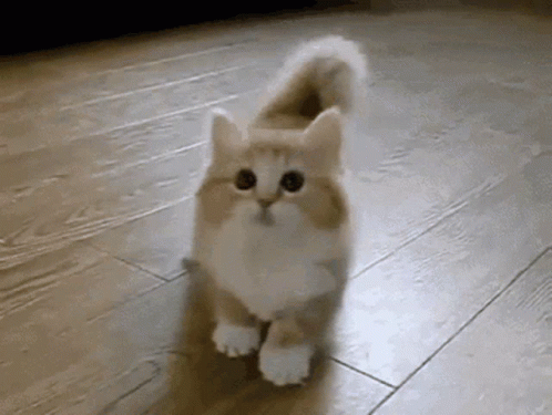 Popis obsahu: a small kitten is walking on a wooden floor looking at the camera .