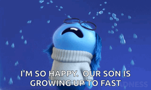 የይዘት መግለጫ: a blue cartoon character is crying and says " i 'm so happy our son is growing up to fast "