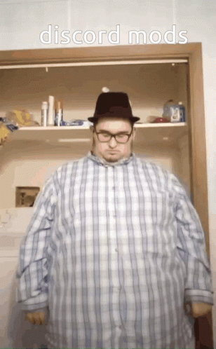 የይዘት መግለጫ: a man wearing a plaid shirt and a hat stands in front of a closet with the words discord mods written on it
