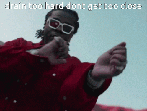 የይዘት መግለጫ: a man wearing sunglasses and a red jacket has the words drain too hard don t get too close above him