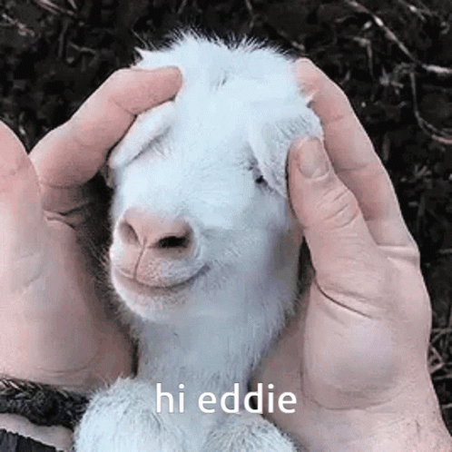 የይዘት መግለጫ: a person is petting a baby goat with their hands and the goat is smiling .