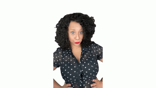 የይዘት መግለጫ: a woman with curly hair is wearing a black and white polka dot dress and red lipstick .
