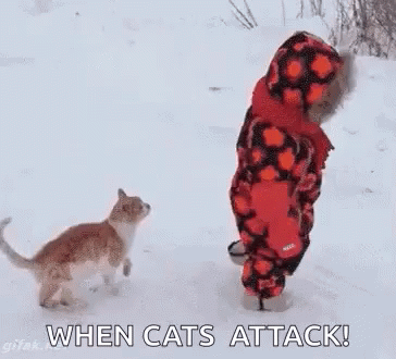 Inhoudbeskrywing: a child is walking in the snow while a cat leaps over him .