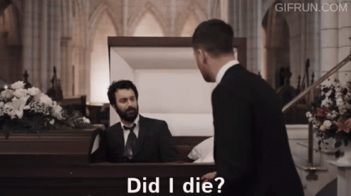 Kontent təsviri: a man standing in front of a coffin with the words did i die written on it