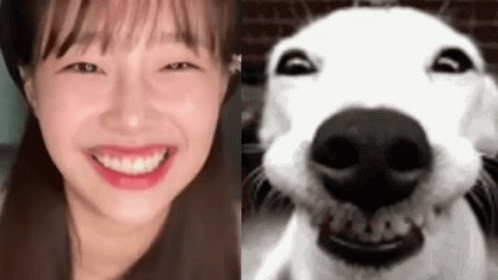 Kontent təsviri: a woman is smiling next to a picture of a dog making a funny face