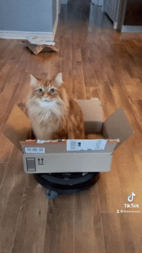 কন্টেন্টের বিবরণ: a cat is sitting in a cardboard box on a robotic vacuum cleaner ..