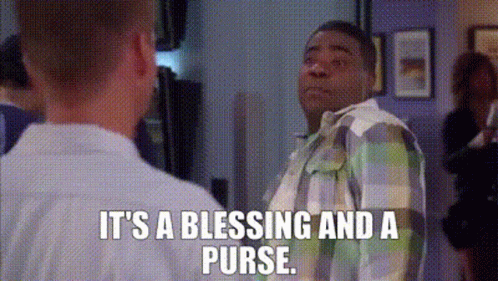 কন্টেন্টের বিবরণ: a man standing next to another man with the words it 's a blessing and a purse
