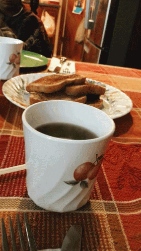 কন্টেন্টের বিবরণ: a cup of coffee sits next to a plate of toast