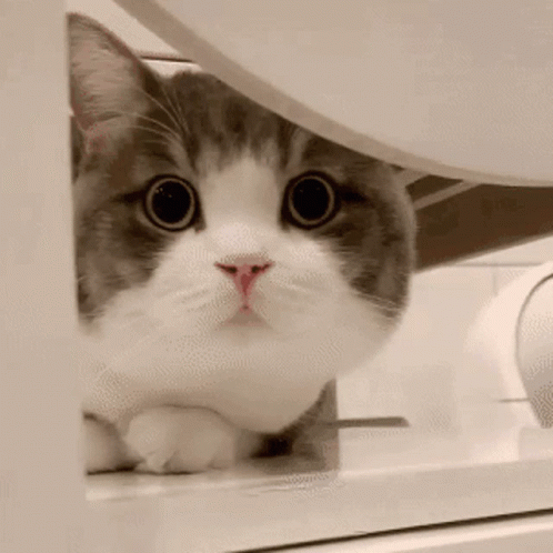 কন্টেন্টের বিবরণ: a gray and white cat peeking out from behind a white shelf .