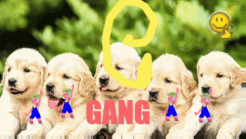 কন্টেন্টের বিবরণ: a group of puppies are sitting next to each other and the word gang is visible