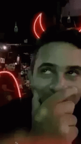কন্টেন্টের বিবরণ: a man wearing devil horns covering his mouth with his hand