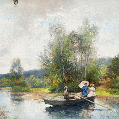 কন্টেন্টের বিবরণ: a painting of people in a boat on a lake