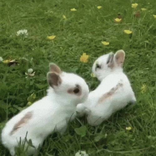 কন্টেন্টের বিবরণ: two white rabbits are playing in the grass and one is scratching the other 's back .