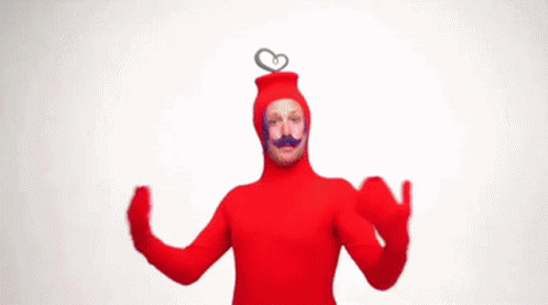 Апісанне змесціва: a man in a red teletubbies costume is running .