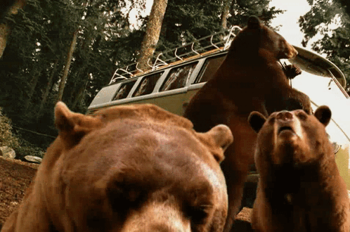 Апісанне змесціва: a group of bears standing in front of a van with a kayak on top