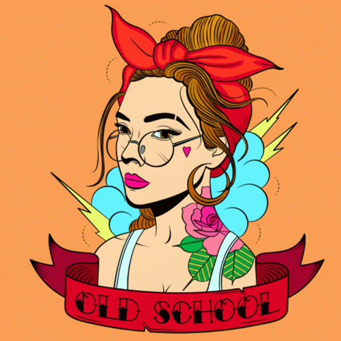 Апісанне змесціва: an illustration of a woman with glasses and a red headband with the words old school written on it